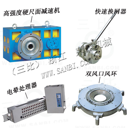 1) 自動吸料機 2) 壓花輪 3) 表面處理 4) 旋轉模頭 5) 空氣壓縮機 6) 快換網裝置 7) 自動升降